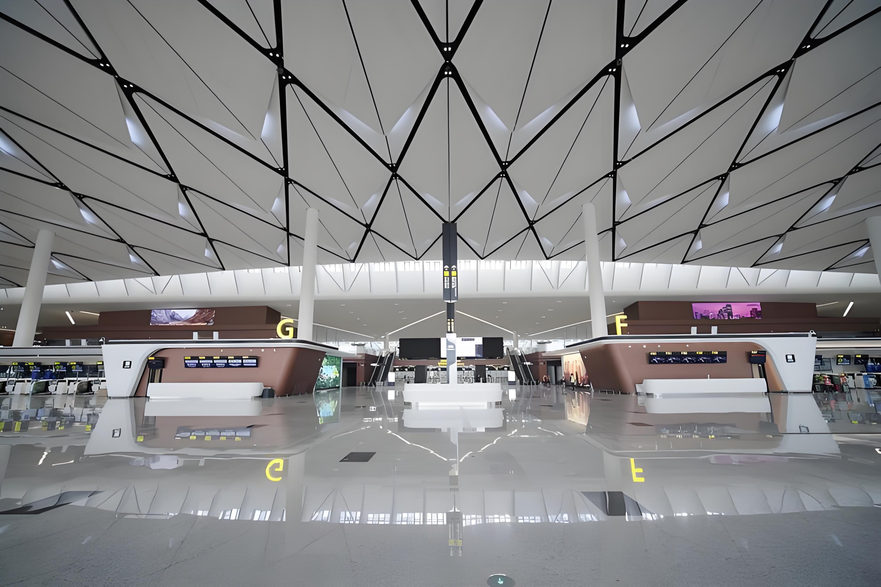 成都天府机场:天府机场航站楼的吊顶设计独特,采用竹叶状和羽毛状造型。其上铺设的漫反射铝卷,不仅天花吊顶外观干净整洁,而且还凭借铝卷让光线均匀反射,大幅提升值机区域亮度,营造光线更柔和、更温馨的候机环境。